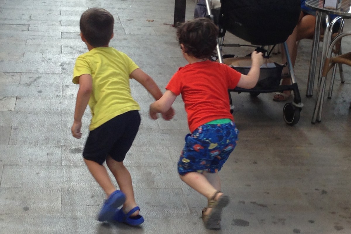 These two little pals were enjoying a bit of freedom from the constraints of sitting still at one of the sidewalk tables with their mums, and the entire block stretched open to them.