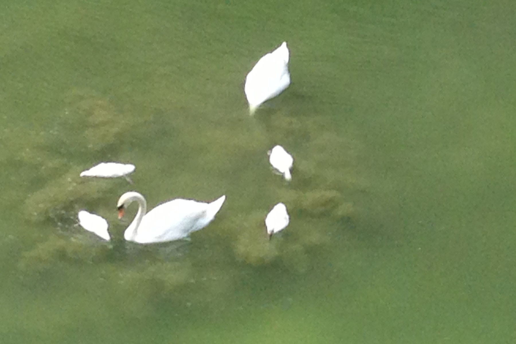 What could be mistaken for fluttering pieces of linen surrounding a mature swan are actually its mate and four of the little ones bobbing gracefully for food, as may be seen by the gently churned waters surrounding each immersed beak.