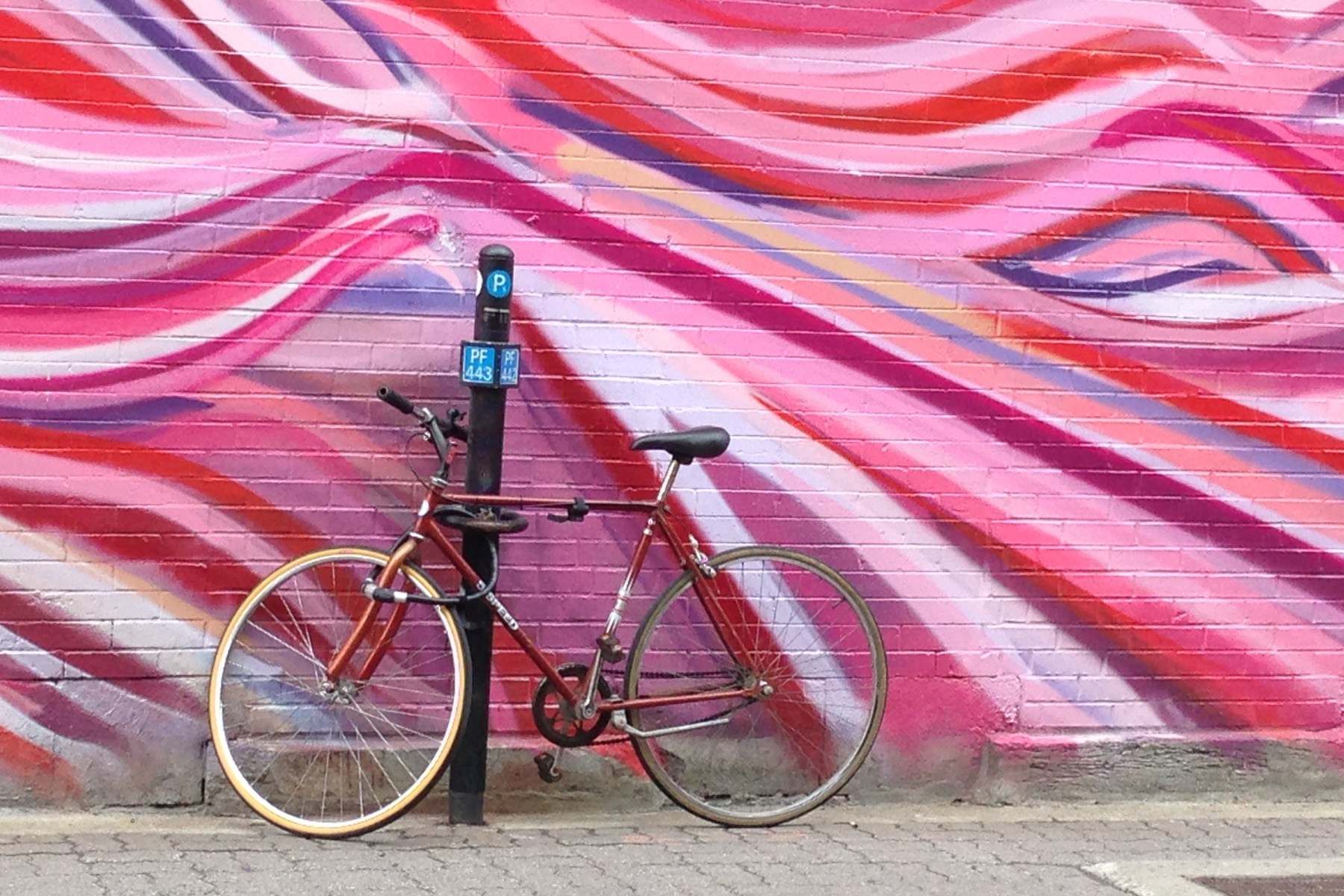 You’ll find wall murals on more than a couple of Montreal buildings, and I appreciated the art work on this one, as well as the sense of motion conveyed – all the more so for the bike parked in front.