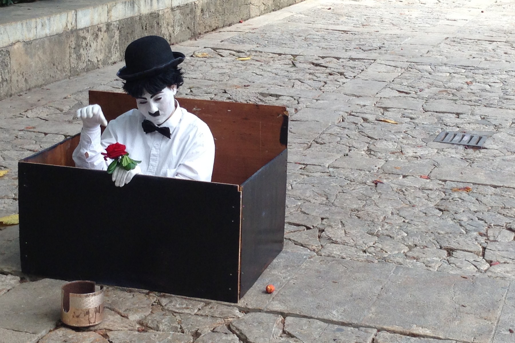 All alone in her little spot on the plaza, this Chaplin-esque young gal was nonetheless in full character and full of optimism, as seen by the tin in front of her box.