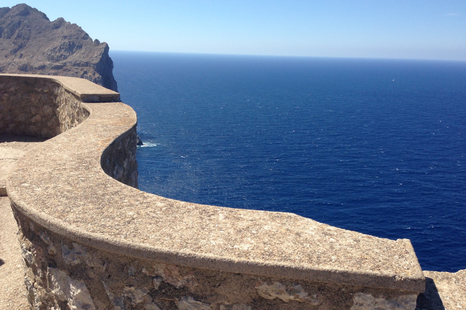 The road is winding, and to describe it as narrow in places is to practice the art of understatement; the trip is, however,  well worth the careful maneuvering. This image is only one of the multiple views from Mirador del Pass, where you are a stunning 350 meters above the Mediterranean Ocean. Carry on up an even narrower road after this view point, and then walk 200 meters, and you’ll have reached the pinnacle: a lighthouse, no longer in use, that was built in 1892. A look around the cliffs will reveal beauty at every turn, including Platja de Formentor, a beach (cala), wrapped around a stunning bay housing boats and weekends of which many may only dream.