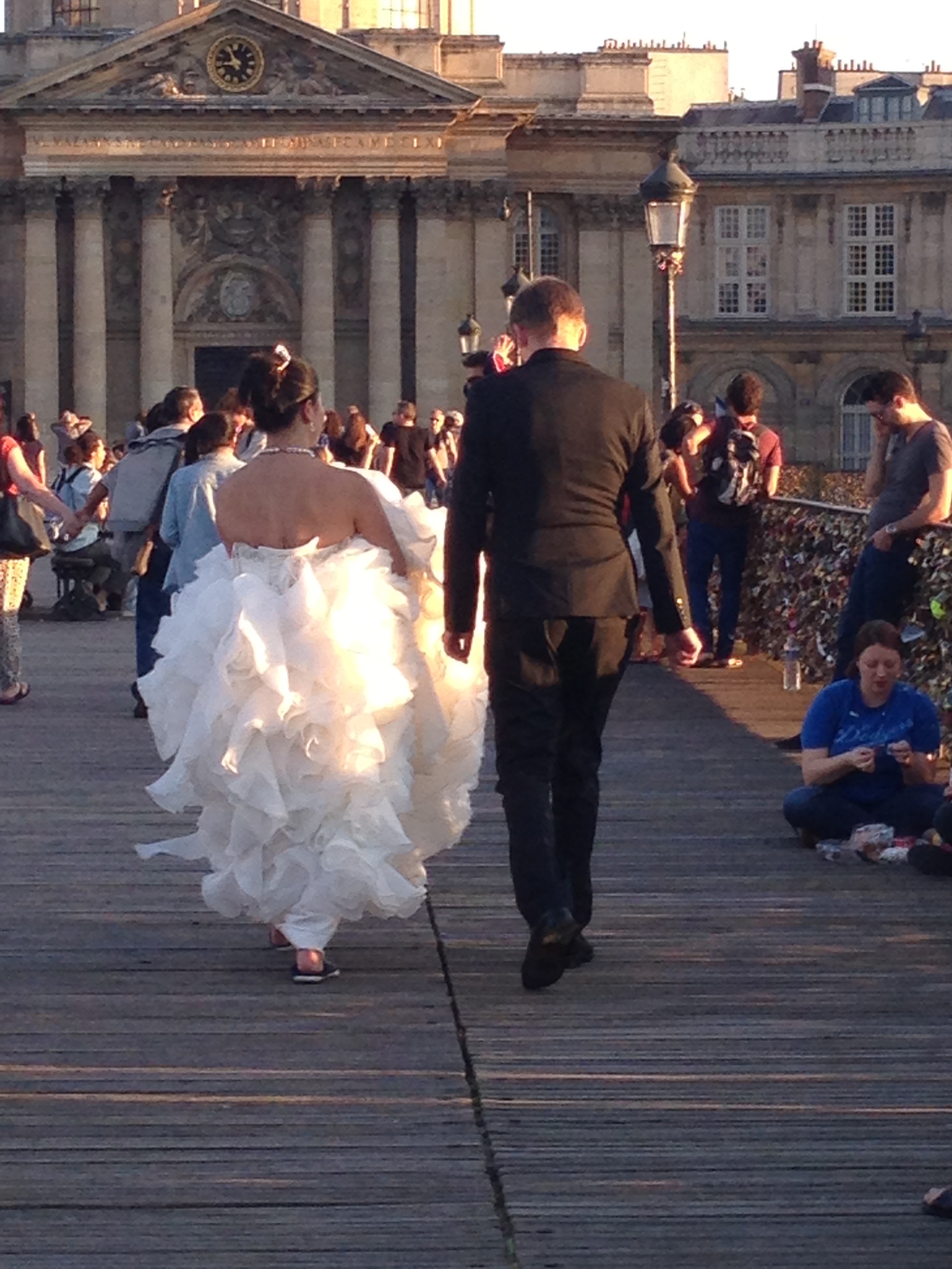 While I’ve recently published some images of French military members after this year’s Bastille Day formalities, there was so much more to the day, including these happy young newlyweds crossing the city’s Pont des Arts following their ceremony.