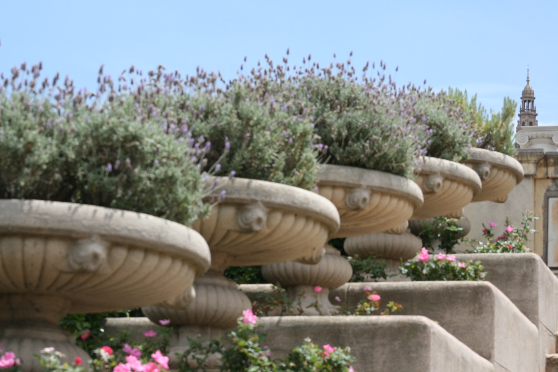 The building is, however, relatively new; it was built for the International Exposition of 1929. The approach is beautiful and includes fountains and tiers of staircases and lavender-laden planters, such as these.