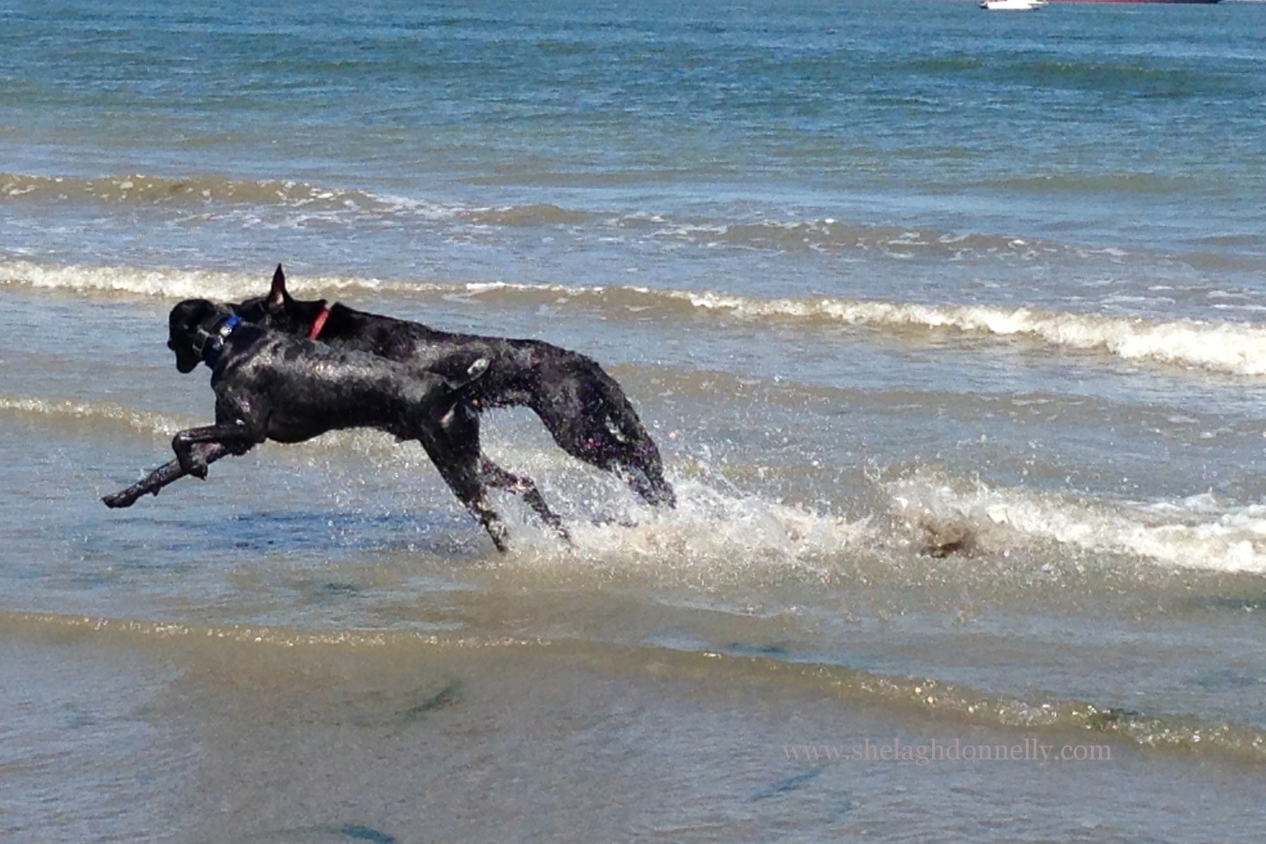 … and splashing, followed by plentiful tail wagging when kindred spirits meet. All this, of course, is only the precursor to earnest spraying of one’s family with whatever water was not already shaken off in galloping out of the inlet.
