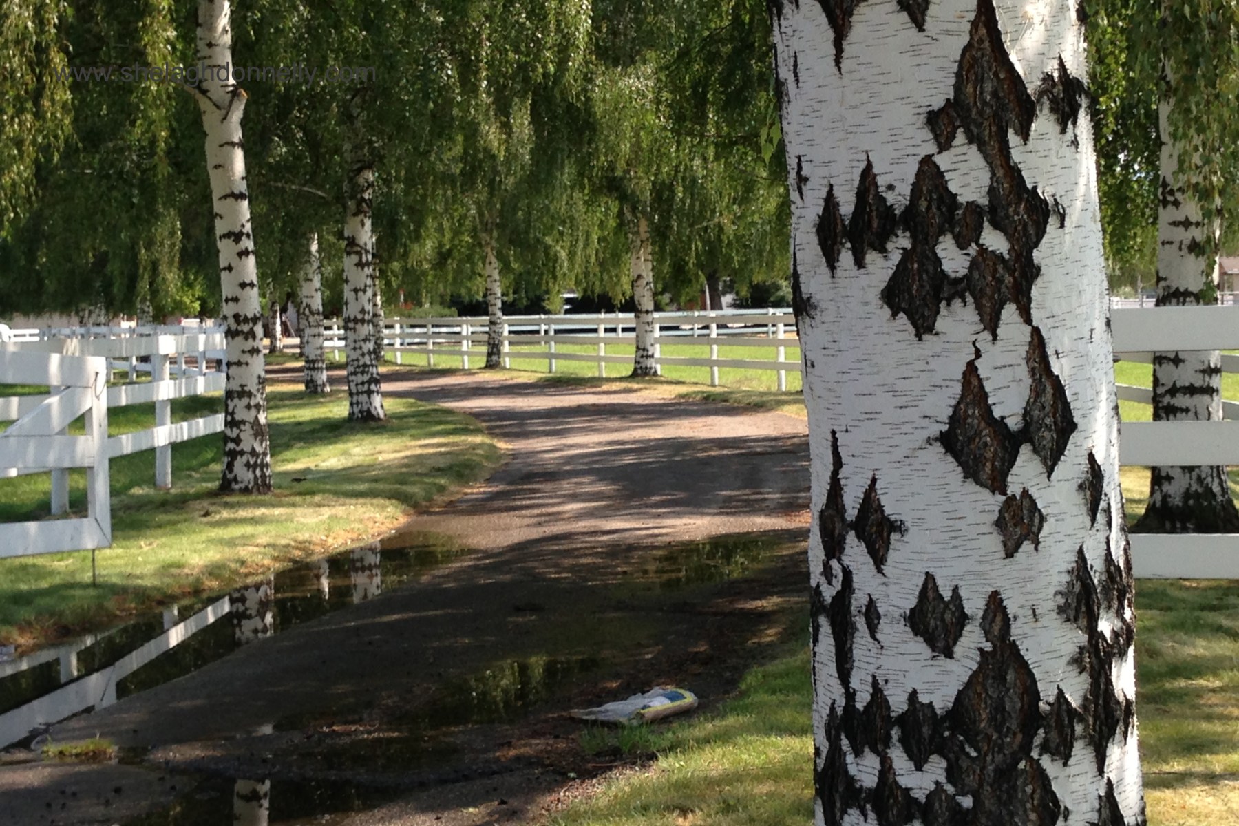 Don’t let the puddles fool you. Kelowna is dry, dry, dry much of the time during summer months, and the small reflecting pools by the gate are remnants of much needed early morning irrigation. I’ve driven by and appreciated this long, private driveway untold times, but it was just the other weekend that I stopped to photograph it for the first time. Lined with parallel rows of birches and the perfect white fence, this is but a peak at a dream driveway for country living.