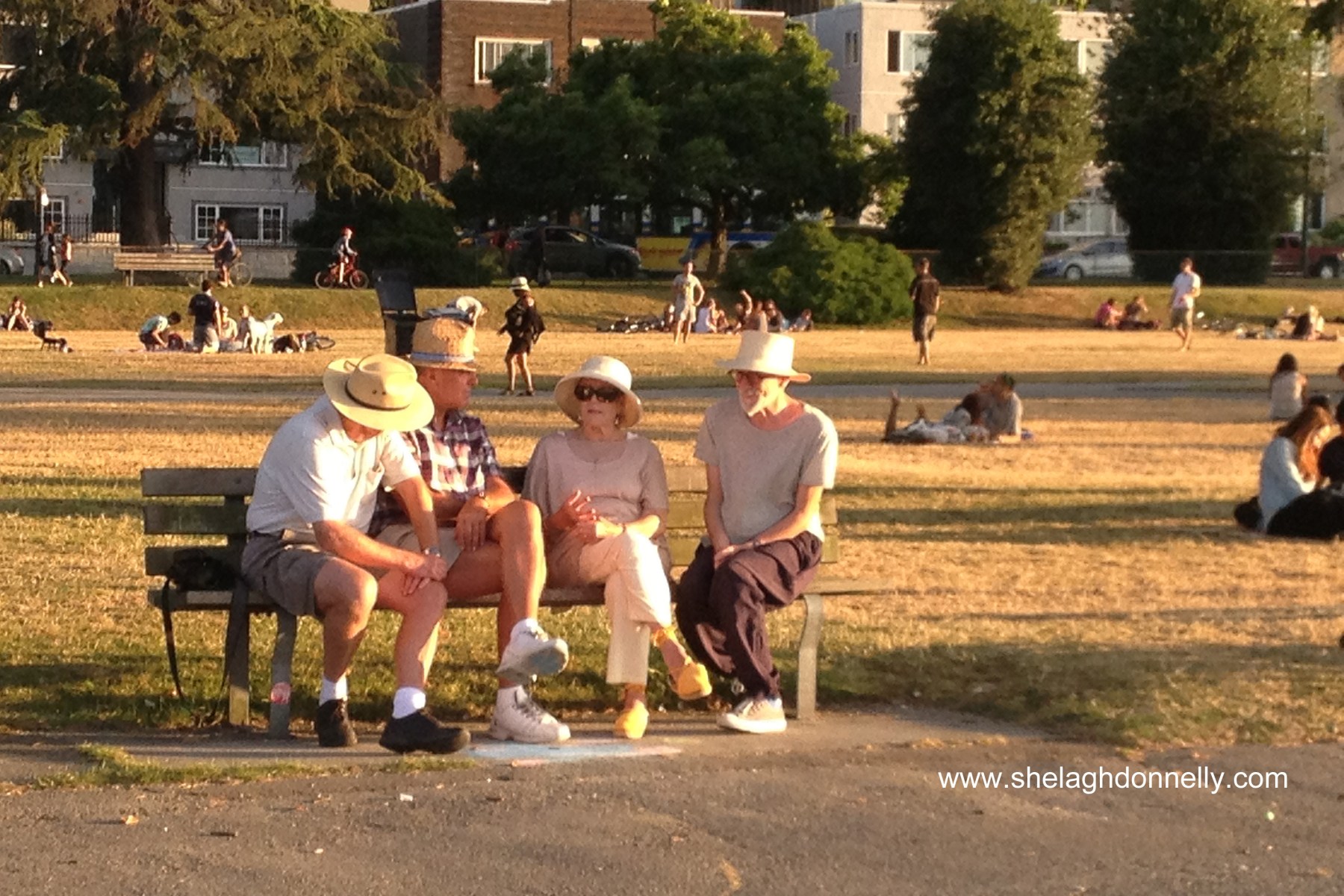 • Thanks! I thought it was fun; rather than absorbing the beautiful ocean and mountain views, these three fellows were hanging on the lovely woman’s every word. Strip away the setting and the years, I thought, and they could have been back in the school yard.