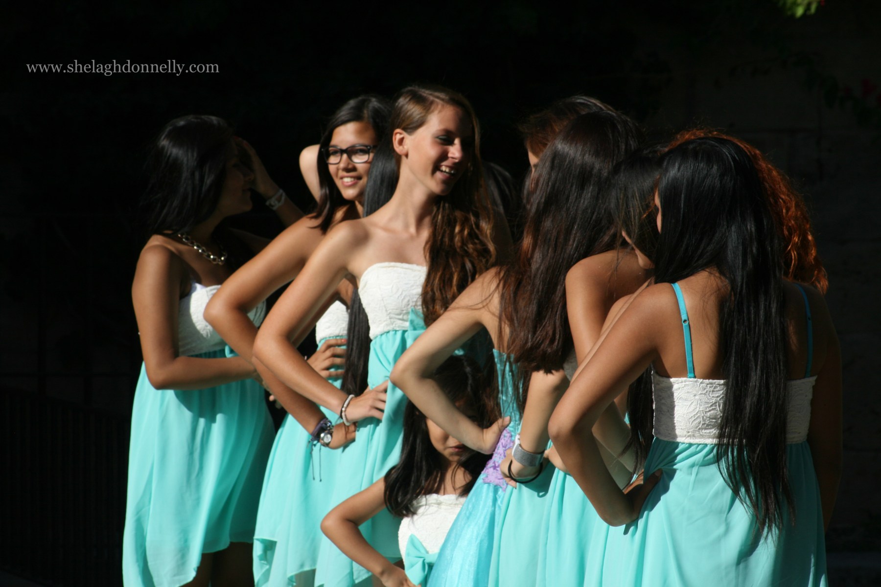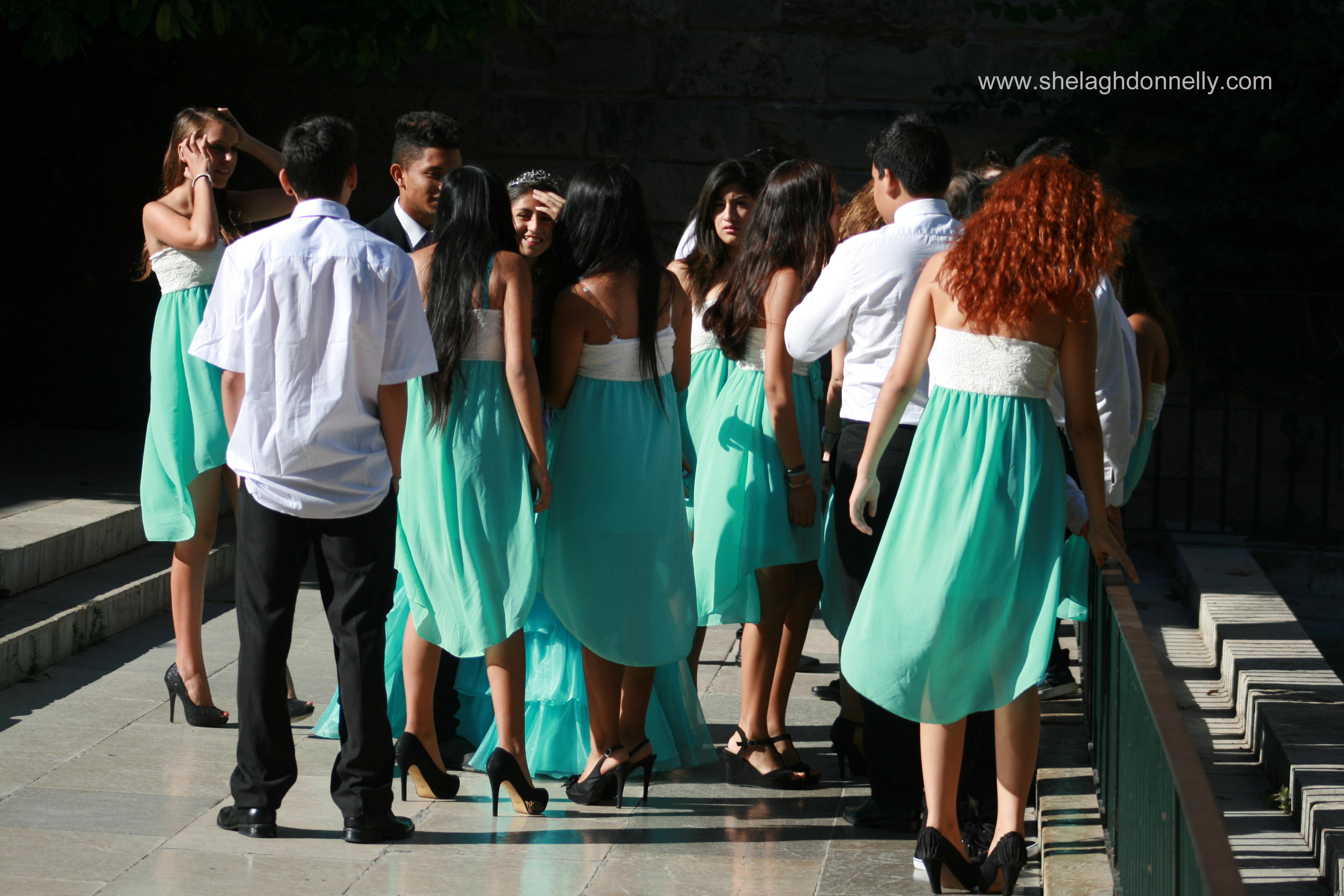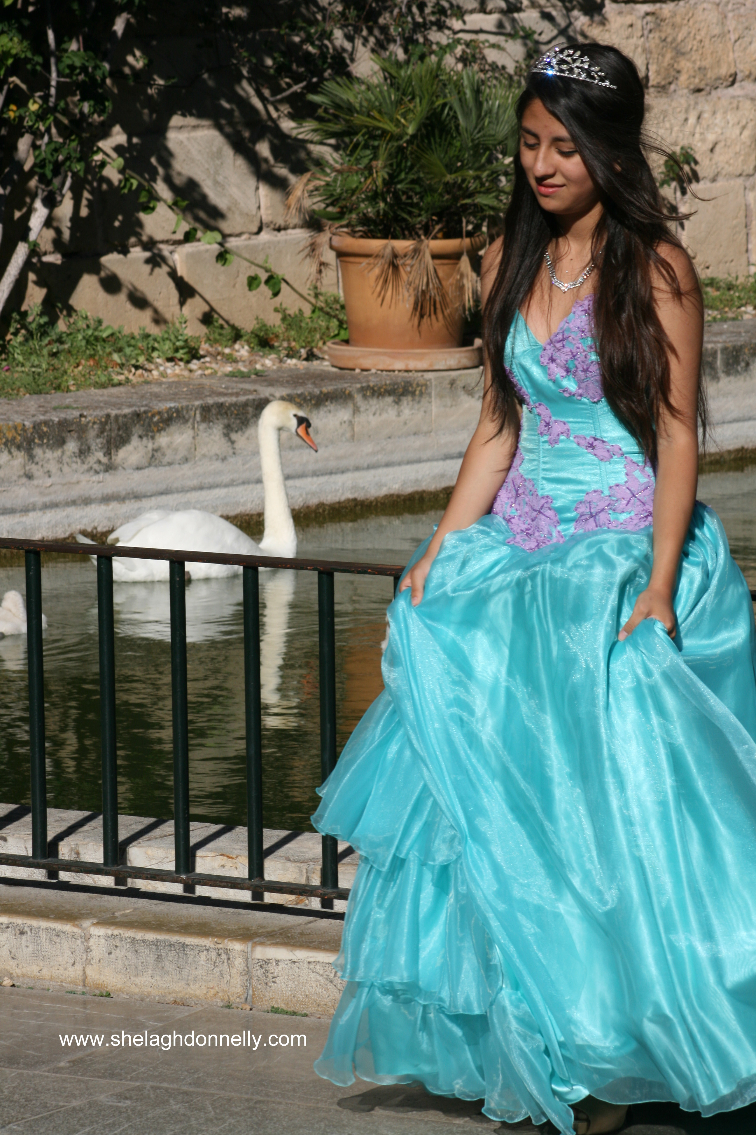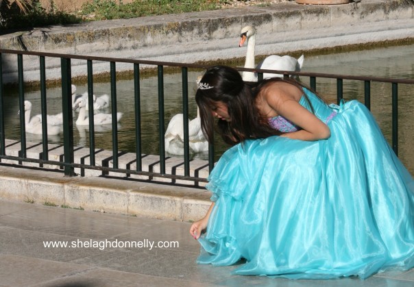 I’d have guessed that these lovely young señoritas and their escorts were gathered for graduation photos, but the presence of the little girl in the centre of the image above – with her own pint-sized version of the others’ dress – made me wonder. We’d again stopped by Palma’s cathedral to photograph the swans when this happy group came along. While one of the girls had, as evidenced by her tiara and more formal gown, been crowned the belle of their ball, each of the girls shone.