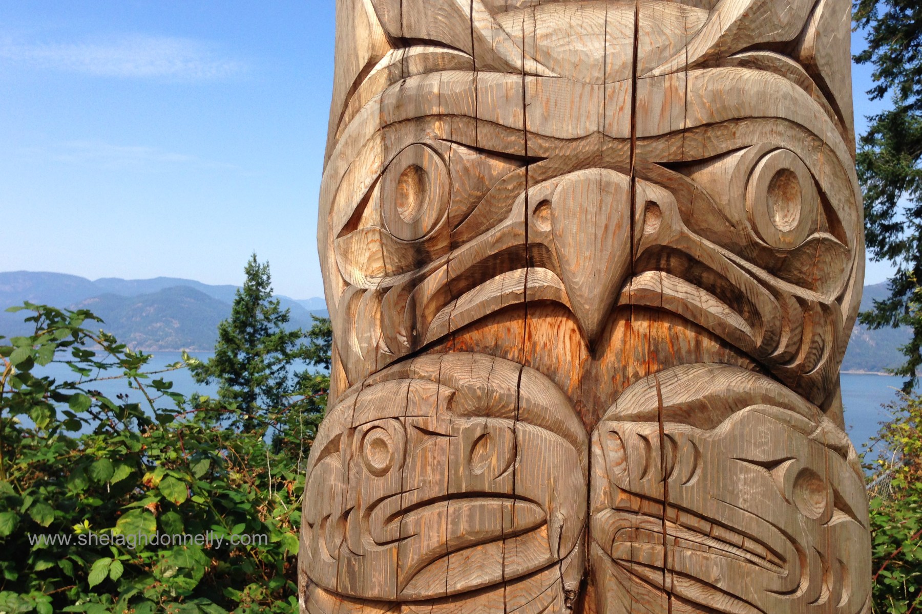Driving the Sea to Ski Highway between Vancouver and Whistler, there’s splendid scenery every where around you. Here, just west of Lions Bay, you can pull off to the side of the road to take in the views of mountains, forests, water and more. Here, with blackberry bushes as part of the backdrop, we have homage to Skwxwú7mesh Úxwumixw, also known as the Squamish Nation.