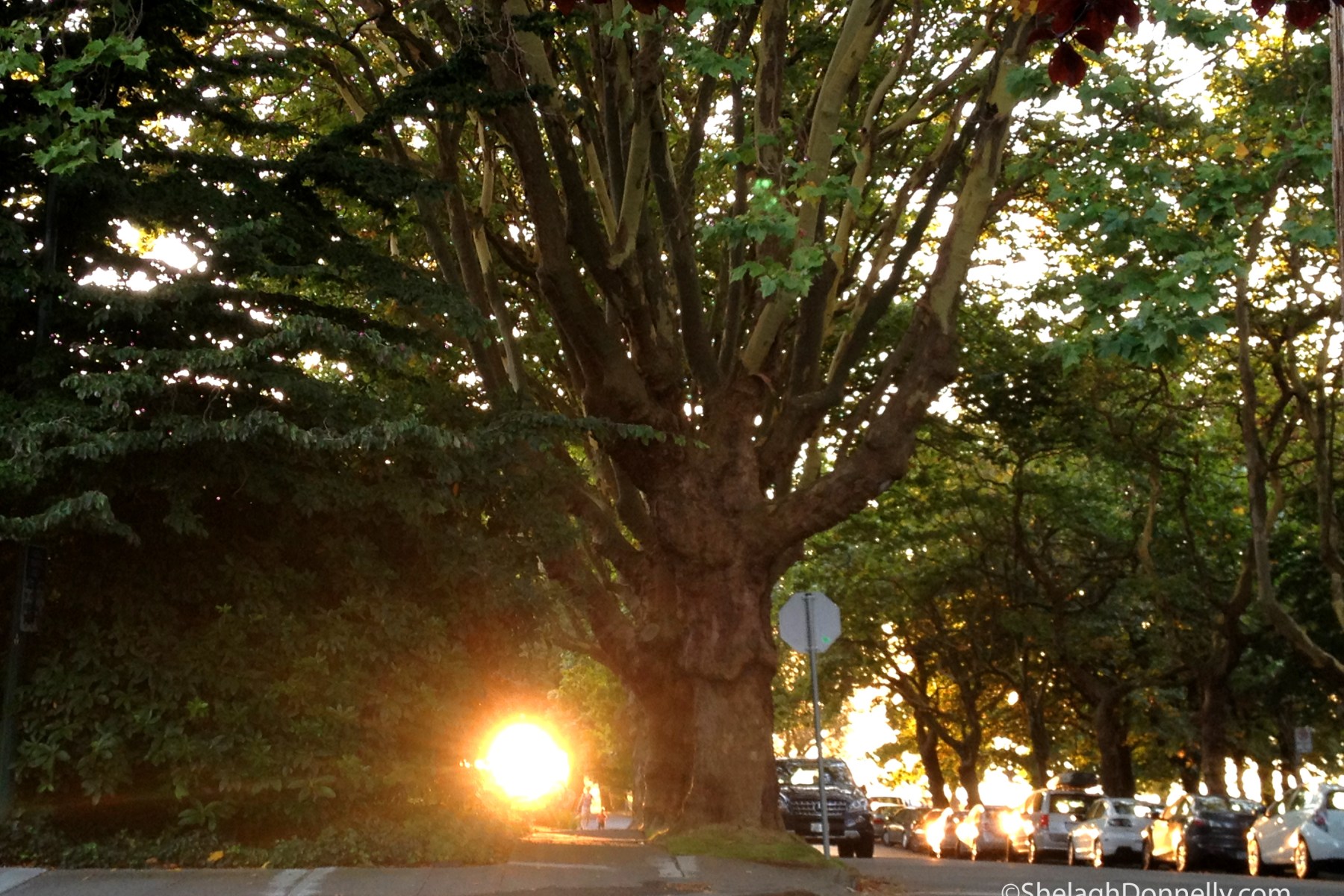 Walking home from the beach a few nights ago, the setting sun gentle on the shoulder, I was compelled to turn back for one last look – and found it appeared almost as though the sun was boring a path amidst the greenery of this quiet side street.