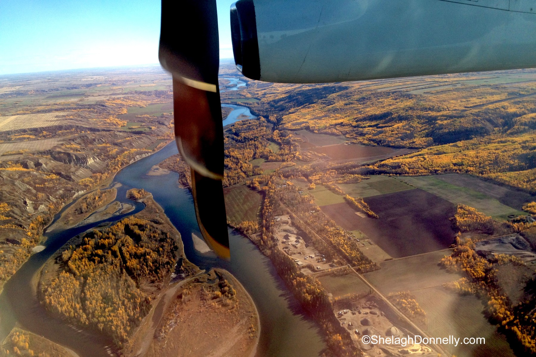 Here’s a sense of what it’s like flying over the Peace River, which winds 1,923 kilometers / 1,195 miles from British Columbia’s Rocky Mountains through to Alberta, the province immediately east of BC. This was day one of my first trip this far north, where we spent time in Fort St. John and Dawson Creek, including a stop at Mile Zero of the Alaska Highway.