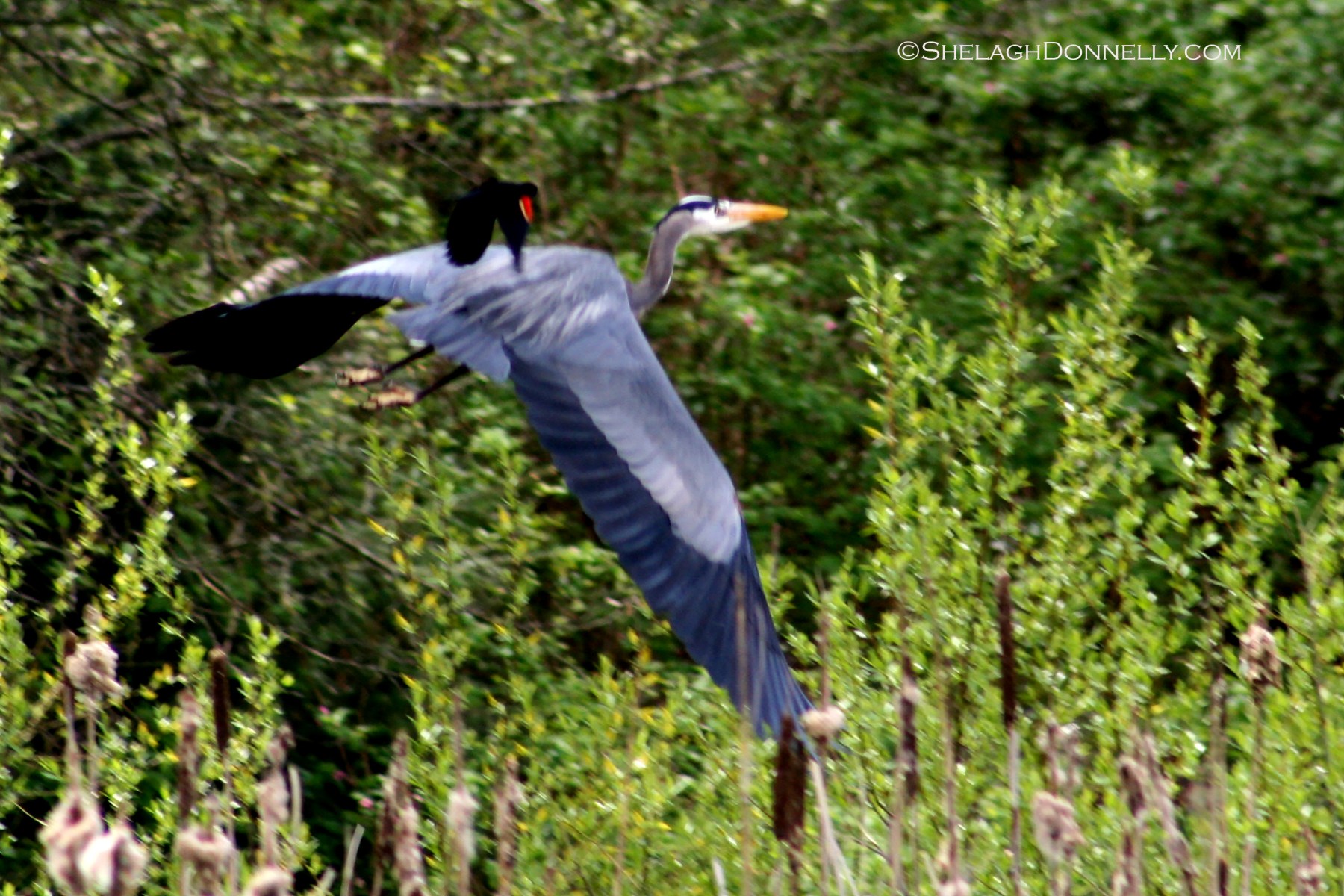Here, now, is the promised image of that interloper making off for higher ground – complete with a smaller companion, the little black bird with red on his wings. Have a look at the long, graceful line of the heron’s wing and you’ll hear it sweep through the air.