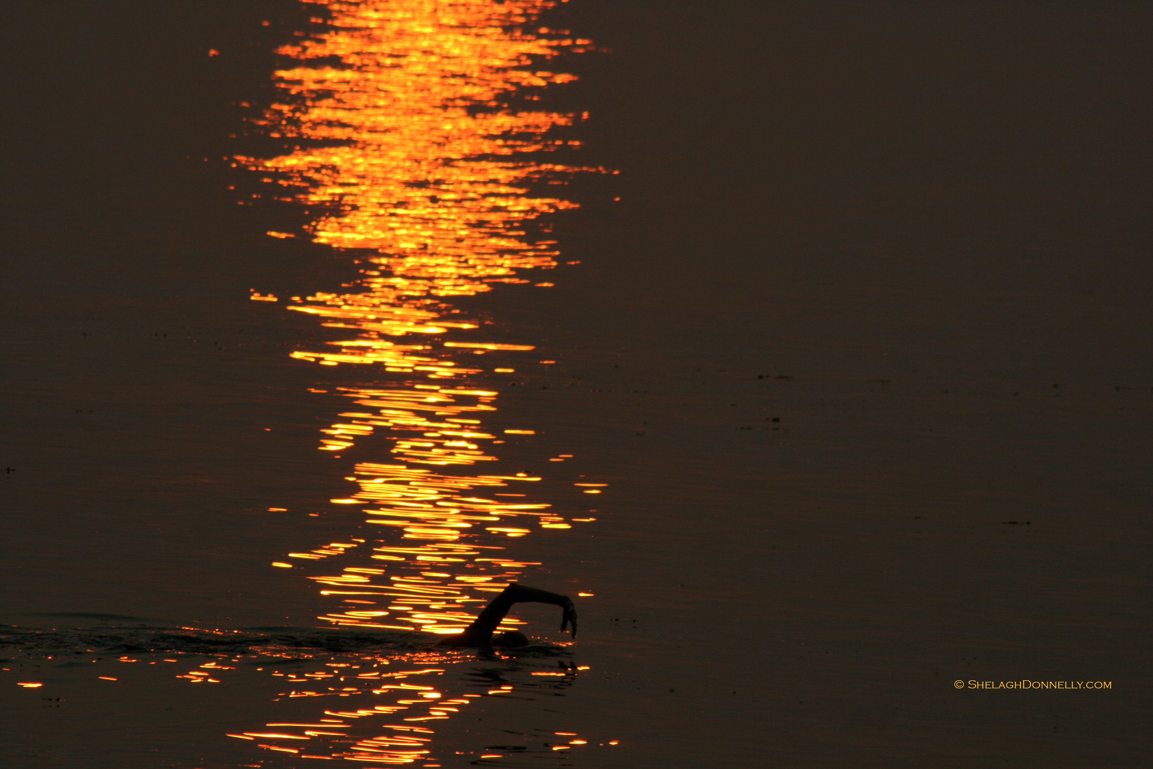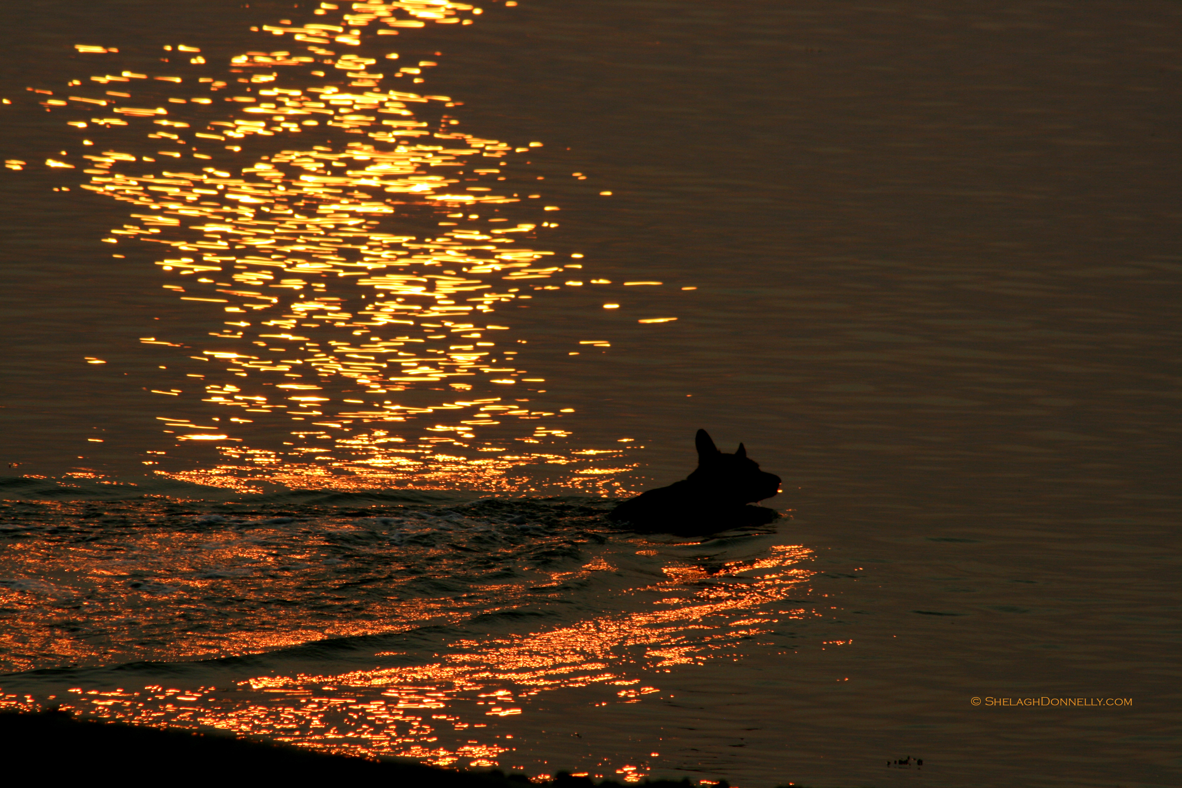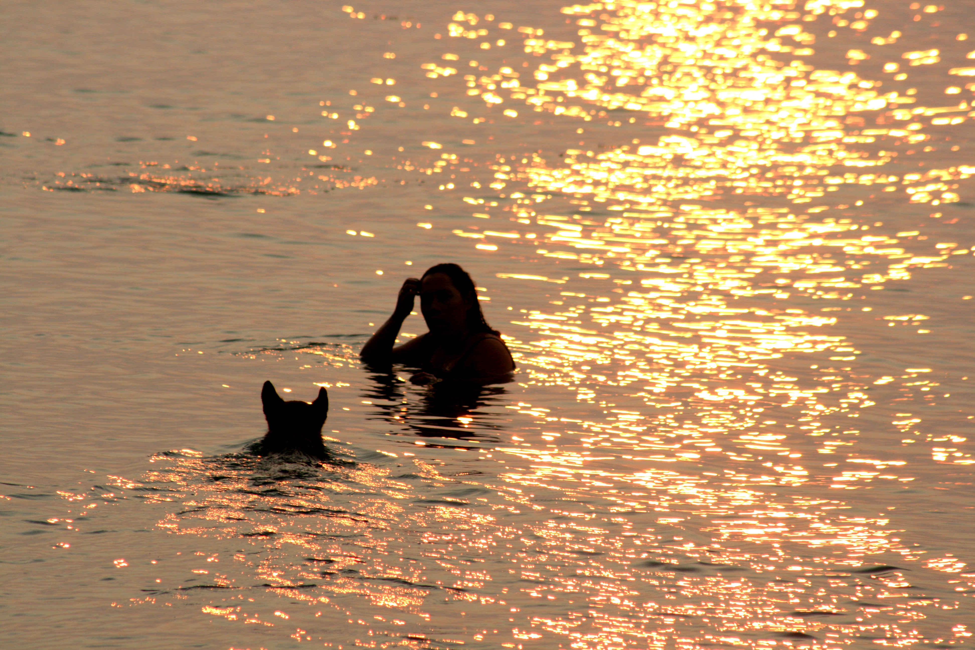 As mentioned the other day, wildfires in BC have made for some dramatic skies – and waters. Above, an evening swimmer glides through the golden waters of Spanish Banks – and, below, we have silhouettes of a canine swimmer and his or her person at different points in the evening. In the first shot below, there’s a sense of the pooch pressing through molten lava.