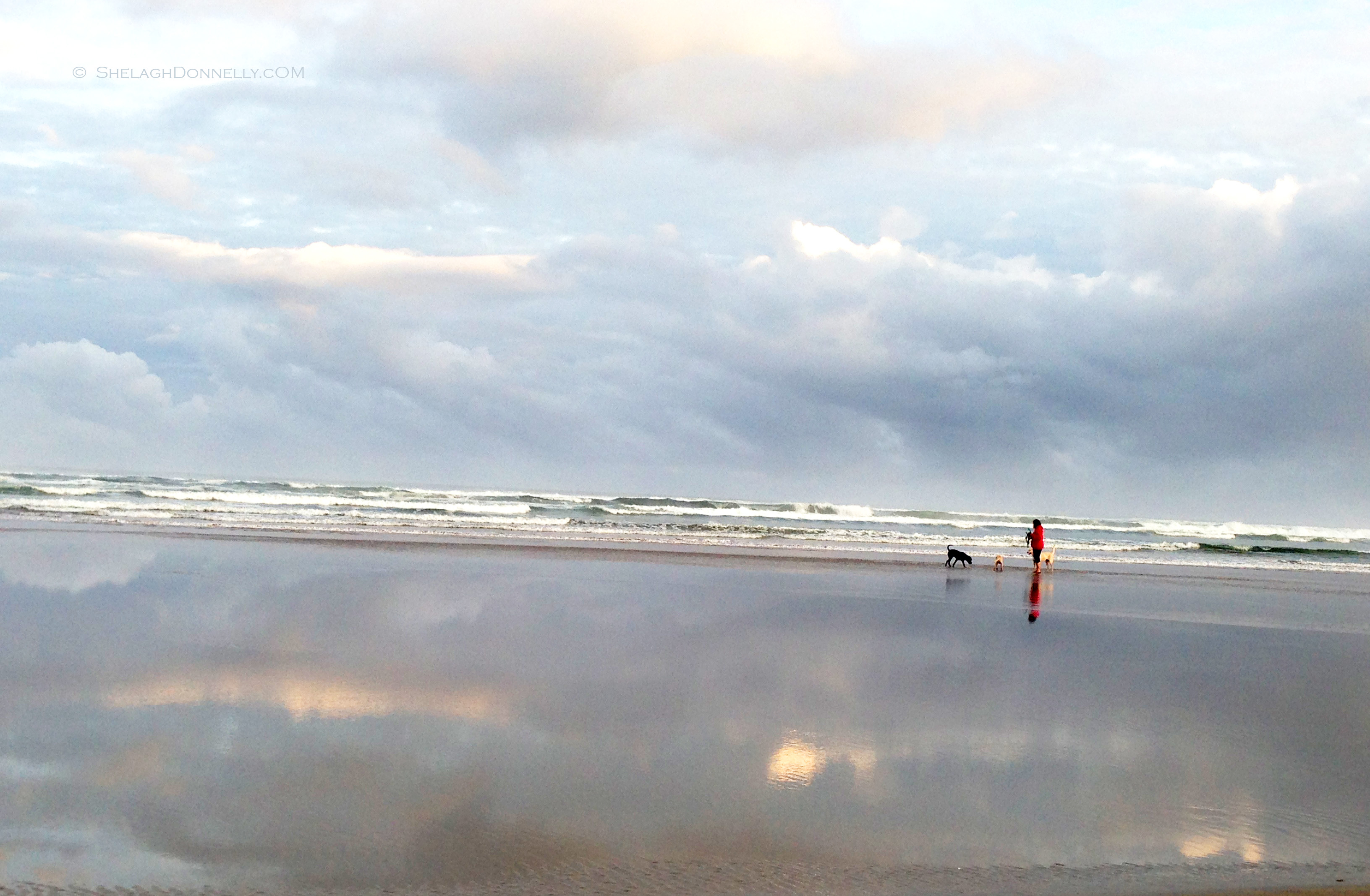 This was a great opportunity to catch the beach in early light, and without clusters of people here and there. Having said that, I did want to capture this brightly attired early morning stroller and her three pooches, simply to offer some contrast to the gentle reflections of sky and clouds in the shallow waters of the beach.