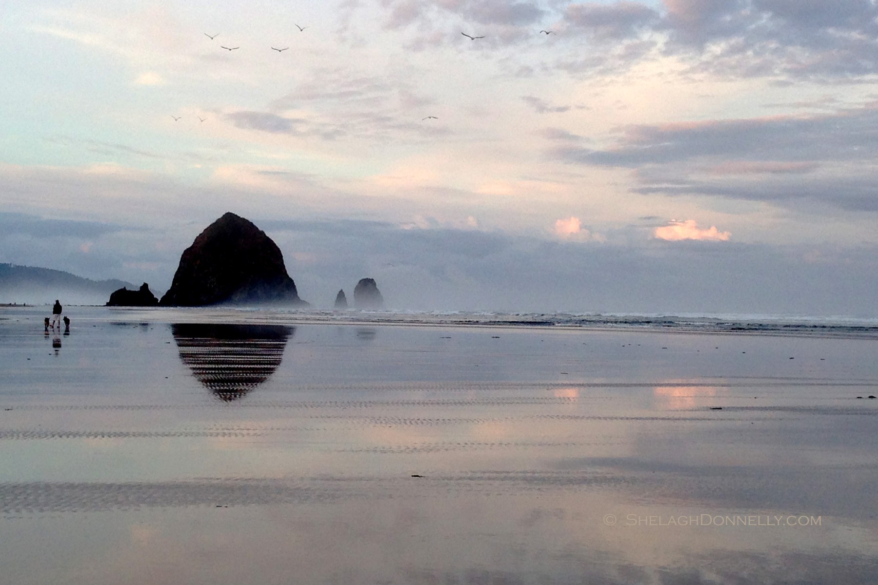 It’s two weeks today that we returned home from the Oregon coast, and its expansive beauty still strikes me. For all the water babies out there, here’s a look at the start of a new day at Cannon Beach, on the shores of the Pacific Ocean.