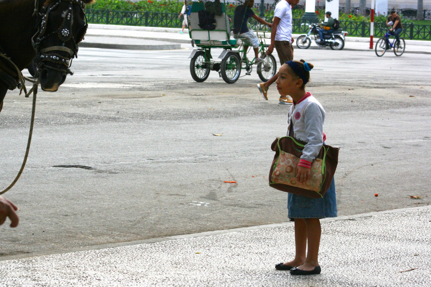 While many of the school children I saw in Havana wore uniforms or matching scarves, that wasn’t the case with all of them. I think that this curious little one, complete with knapsack, was on her way home from class. Her mum had a toddler in hand, and an infant in a stroller … and was clearly accustomed to her eldest engaging with the world around her. Horses pulling buggies are not at all unusual sights on Havana’s streets, but it seemed that this schoolgirl was keen to strike up a somewhat cheeky conversation with the horse.