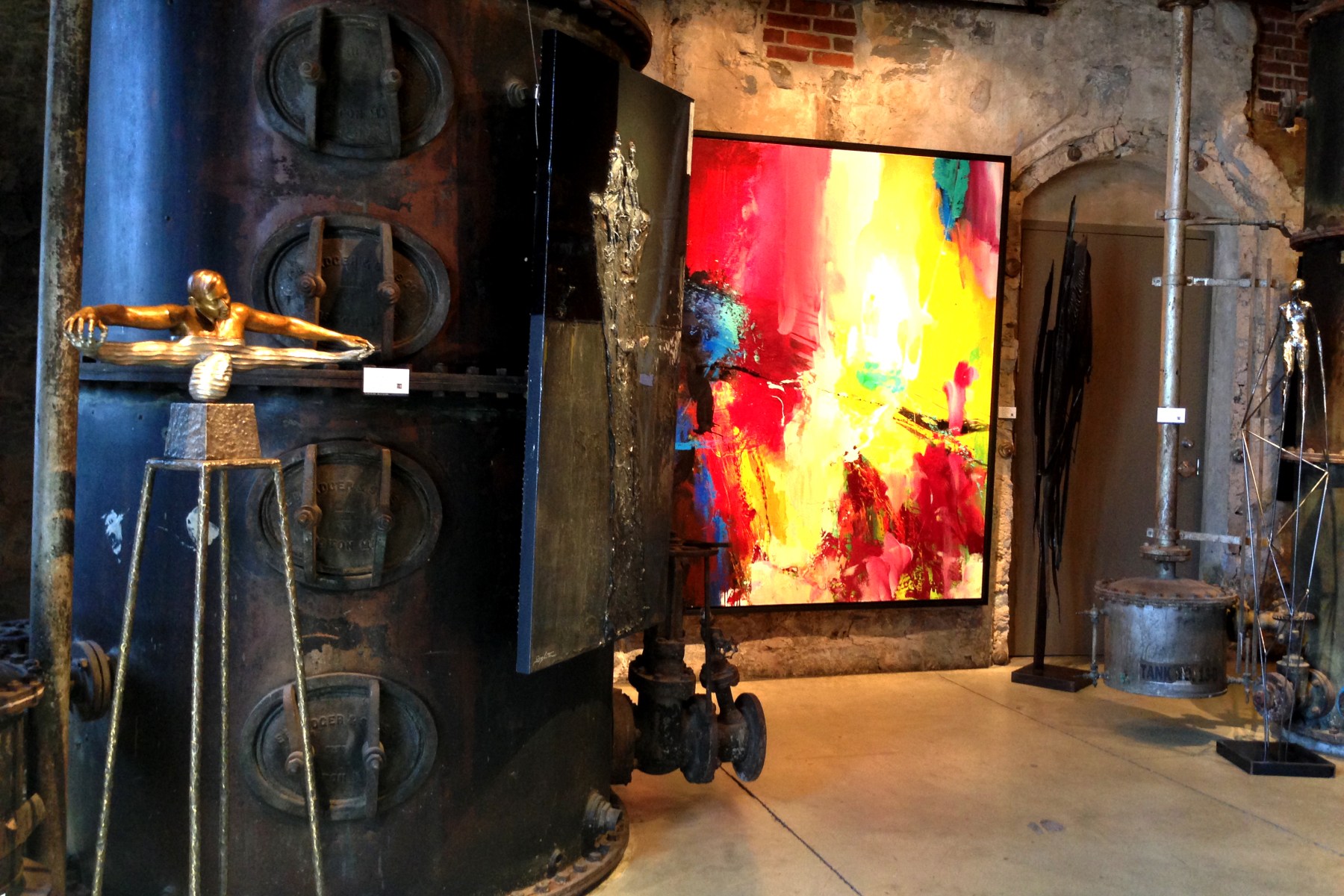 In Toronto’s Distillery District last month, I appreciated a number of pieces in the Thompson Landry Gallery’s Cooperage Space … and all the more so when juxtaposed, as with these pieces, with the exposed brick and with (perhaps original?) fixtures such as those you see in this historic building.