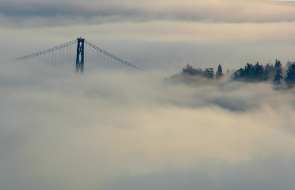 In the fog earlier this month, you’d be hard pressed to recognise the park at all. I drove across Lions Gate Bridge to reach Cypress Mountain but, as you can see here, even the bridge was barely visible.