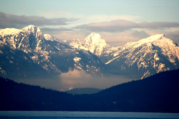 Vancouver in winter … the skies were blue and clear as this day dawned. Here, as afternoon approached its close, the sun cast a gentle sheen over the snowy North Shore mountaintops.