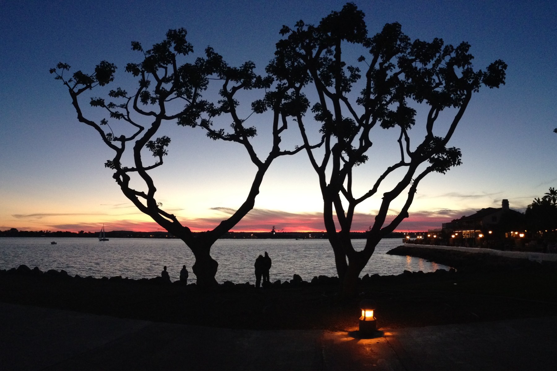 Here, on the San Diego waterfront, we have early nightfall, just seconds after the sun dropped below the horizon of the Pacific Ocean.