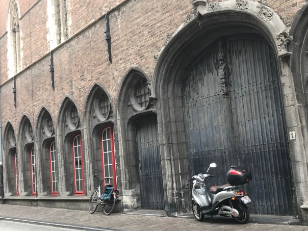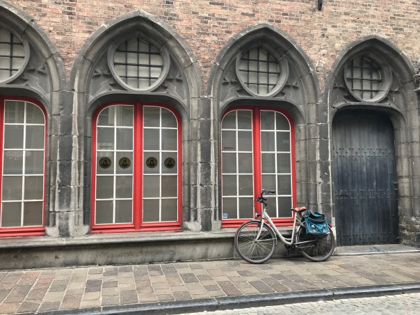 The backdrop for these cyclists, some of a dozen or so who passed by in the space of a minute? Here, we’re just off the Market (Markt) Square, and the side of the landmark Belfry Tower.