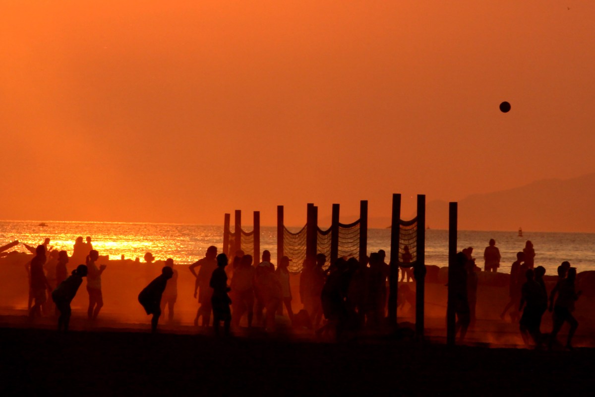 As mentioned the other day, wildfires in BC have made for some dramatic skies – and waters. Above, an evening swimmer glides through the golden waters of Spanish Banks – and, below, we have silhouettes of a canine swimmer and his…